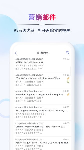 邮件数据多端实时同步更新,新邮件提醒,及时回复客户邮件,锁定每一个商机;联系人卡片,帮助快速识别客户类型,聚合往来邮件,转化邮件线索。