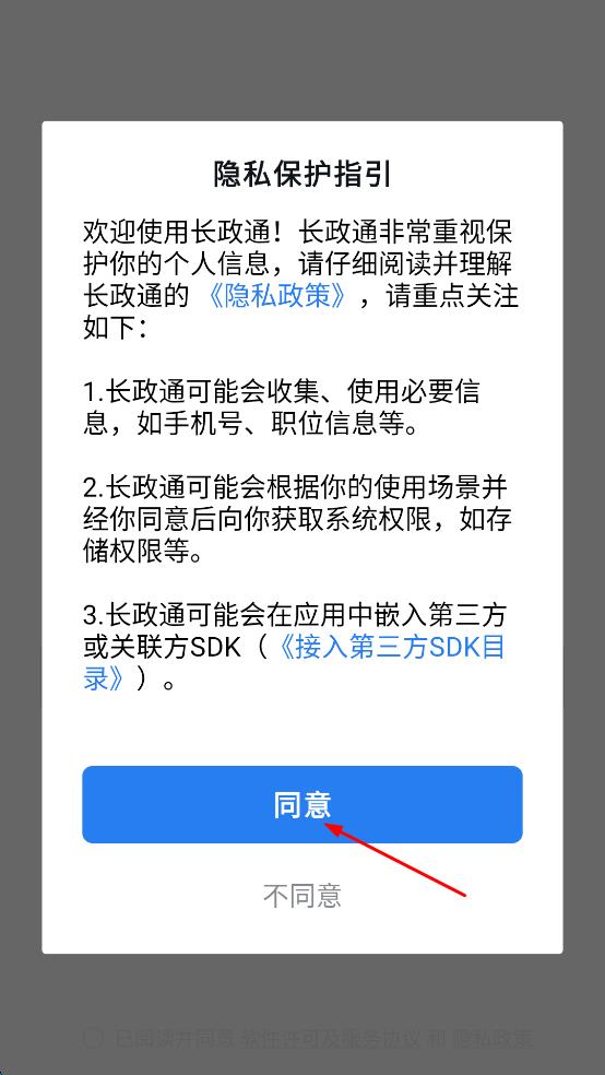 1、打开长政通,会出现隐私保护指引界面,仔细阅读后点击“同意”。