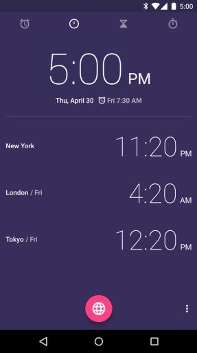 可以发现采用的是 material design 设计风格,而且界面十分清爽。首先是一个当前时间显示的界面,你可以点击下方的地球按钮添加多个不同国家地区的当地时间。
