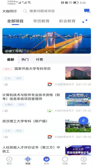 大咖同行软件安卓版专注于职业教育服务,在这里你可以查看最新的职业资格和学历教育方面的资讯和政策,企业可以发布项目,学员可以查找项目,众多认证机构入驻,支持在线找机构,欢迎感兴趣的朋友下载体验!