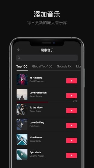 轻松为你的视频和照片添加你最爱的音乐,几百万首来自流行艺人们的曲目任你选择!提供每个音乐流派的最热曲目,包括流行歌、摇滚、雷鬼、电子舞曲、节奏布鲁斯、乡村以及更多。我们庞大的音乐库每天都会更新,因此你可以为你的视频或照片添加你所有最喜欢的歌曲。