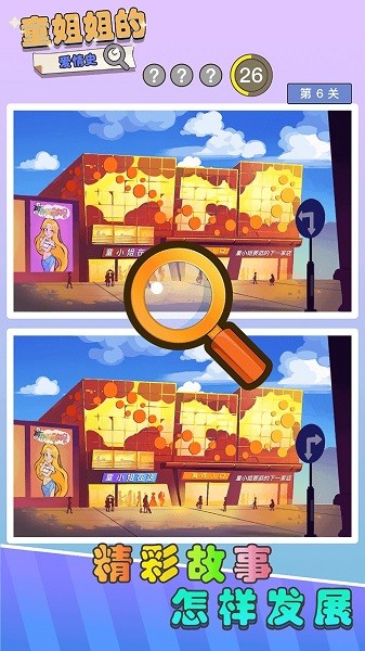 找茬题材休闲闯关游戏,漫画式的场景画风,恋爱类型的游戏题材,玩家在游戏中需要利用自己的火眼金睛,找到童姐姐消失的线索。
