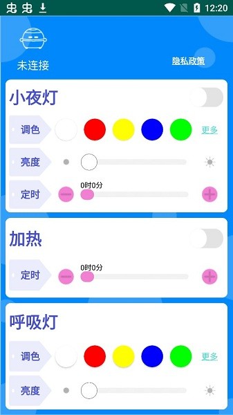 与智能炫彩夜灯加热器硬件配套,打开APP界面,通过蓝牙广播可以扫描到周围加热器设备,然后通过发送和接收蓝牙广播可以修改加热器的状态,及在APP上显示加热器当前的状态。
