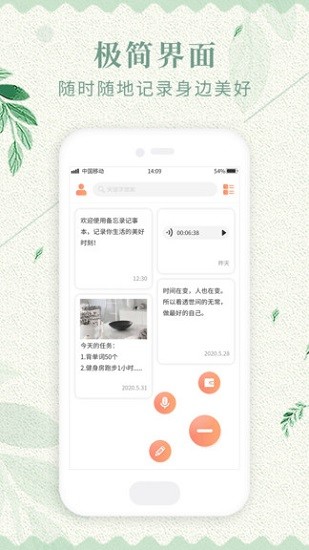 记事备忘录一款懒人必备的记事工具,线上记录的方式有很多种,无论是文字记事还是语音记事都是可以的,还可以在正文里添加语音等,让你的记事变得丰富起来。线上也可以为你的记事进行分类,还能利用关键词搜索记事的内容,欢迎有需要的朋友下载使用!