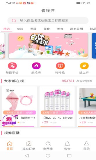 省钱汪app是超齐全的手机购物类型的软件,在这里用户们能够找到超多的商品进行购买,每一种商品都能够找到大额的优惠券进行使用,让用户们能够在这里省下超多的钱。平台上的商品种类非常的全面,让用户们能够在这里享受到一站式购物的方便快捷。