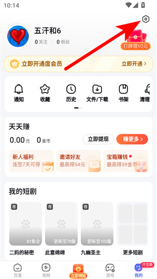 1、打开百度应用进入首页,进入个人中心页面,点击右上角的设置图标。
