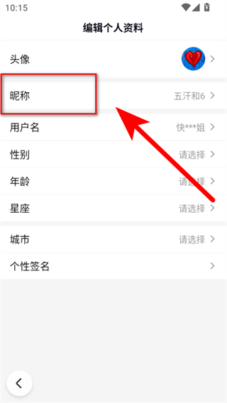 4、在编辑个人资料页面,点击昵称选项,进入设置昵称的编辑界面。