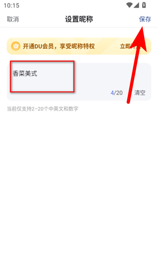 5、在设置昵称界面输入新的昵称内容后,点击右上角的保存按钮,即可完成昵称更换。
