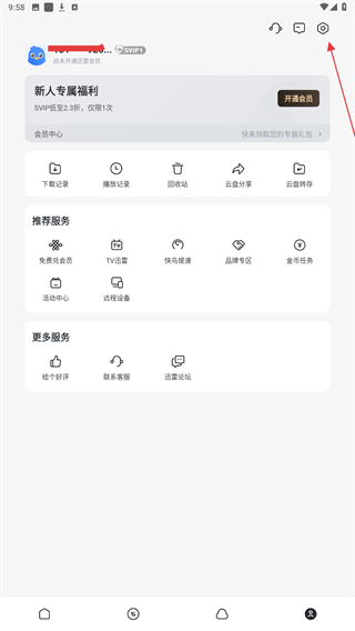 1、打开迅雷进入个人中心页面,找到右上角的设置图标,点击该图标进入设置页面。
