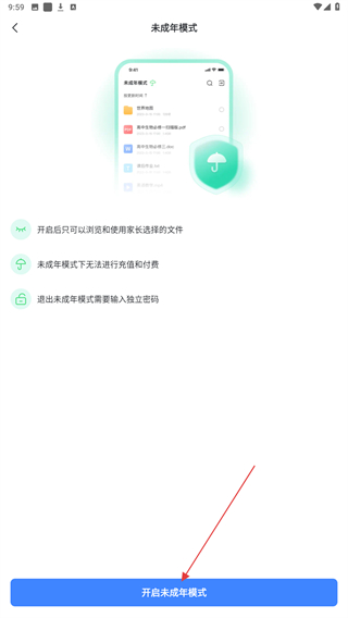 4、在未成年模式界面点击底部的开启未成年模式按钮,即可启用该模式。