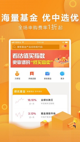 万得基金,数据更专业!万得基金是Wind旗下基金销售平台,依托Wind二十余年金融数据领域的深厚基础,致力于为投资者提供更专业的基金投资服务。万得基金是获证监会核准的正规基金销售持牌机构,已同大部分基金公司建立合作关系,覆盖全部基金品种,代销5000余只基金,申购费率仅1折起。在这里,小万与你一起玩“赚”投资,选“基”再也不用愁!Wind是中国大陆领先的金融数据、信息和软件服务企业,服务了国内90%以上的证券公司、基金管理公司、保险公司、银行和投资公司等金融机构。基于Wind数据的专业性,我们从上千个指标中精挑细选,制成简约的图形界面,让数据更清晰明白。不管是专业投资者,还是理财小白,都能在万得基金获得更优雅的理财体验。