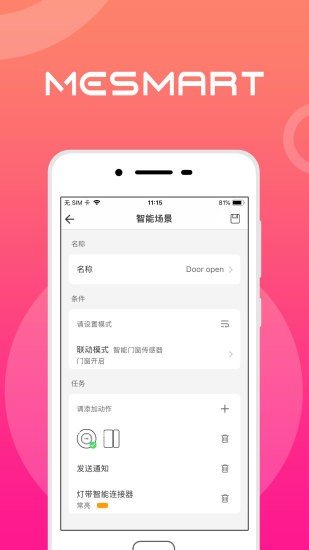 mesmart智能家居软件安卓最新版支持在手机上控制家里的智能设备,支持远程连接和控制,可以按照场景进行智能化的设置,轻松调节开关和各项参数,包括智能网关、开关、传感器等,喜爱的朋友赶快下载体验吧!