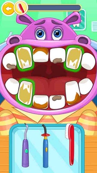 有不同的动物,它们将会是你本次的治疗对象,首先需要清洁口腔,把脏东西拿出来;