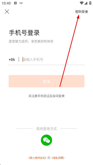2、进入登录页面,找到并点击右上角的密码登录。