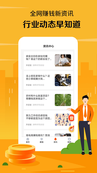 关注行业资讯,了解创业、兼职、项目扶持新政策,让您轻松赚钱,在家致富。