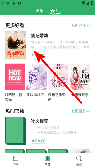 2、在精选页面,选择想要阅读的小说如蜜运婚劫,点击进入小说详情页。