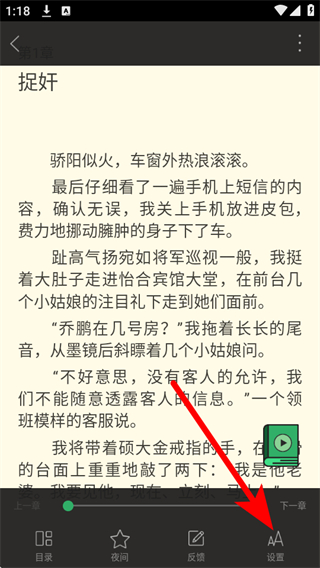 4、在小说阅读页面,点击页面下方的设置选项,进入阅读设置界面。