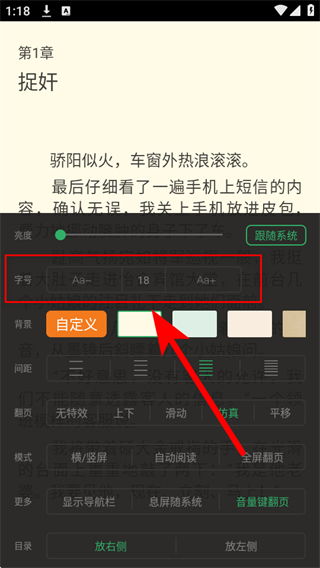 5、在阅读设置界面中,找到字号设置区域,通过Aa-和Aa+按钮调整字体大小,即可完成字体大小修改。