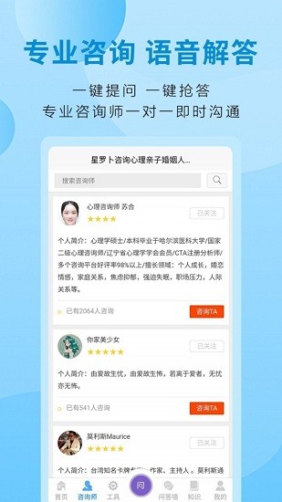 专业的心理咨询平台,随时可以在线上咨询心理方面的问题;