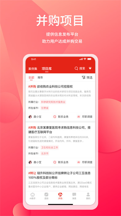 管资本app给用户带来智能的管理服务,丰富的资本运营等相关的信息带用户了解更多,了解企业相关的需求事项帮助解决问题,让企业更好的获取服务资源非常的方便,还有相关的并购项目内容可以进行查询,得到相关的项目信息来进行业务开展,对各个投资并购项目选取与参与并购,可以查看到需要的企业并购的案例信息,快来下载试试吧。