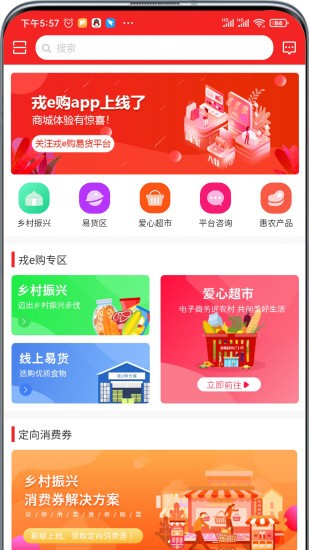戎e购易货平台软件安卓端汇集的商品资源非常之丰富,主要包含了爱心超市、线上贸易以及乡村振新等板块,可以在线领取定向的消费券,还有超多惠农产品可以选购,可以按照商品分类来查找,也可以按照关键字来搜索,欢迎感兴趣的朋友下载体验!