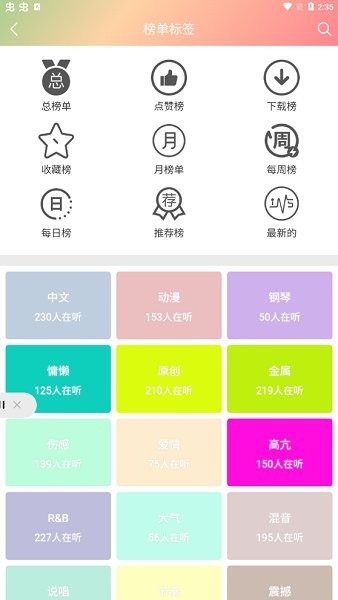 通过榜单将各种火热的音乐资源等进行智能的推广。