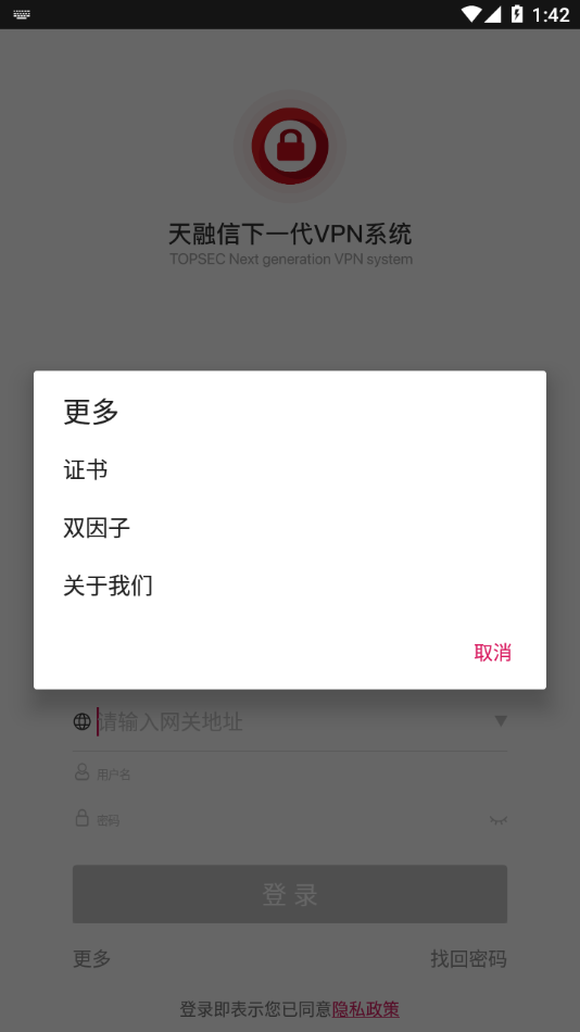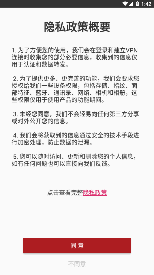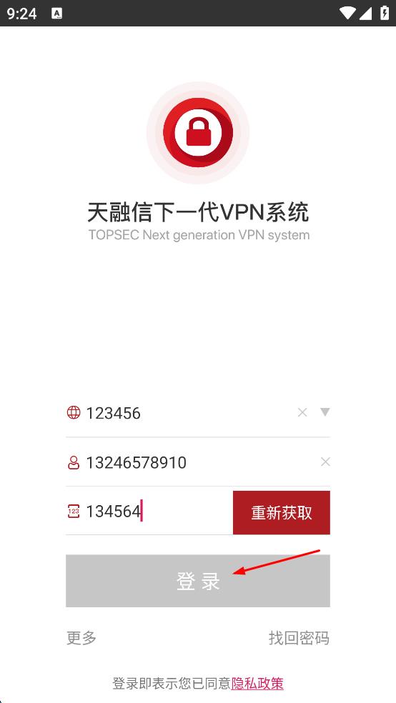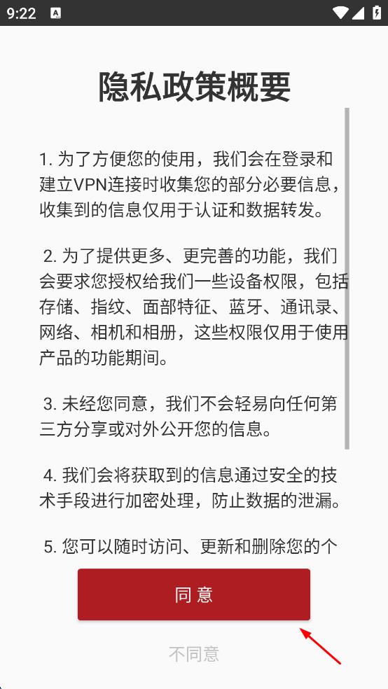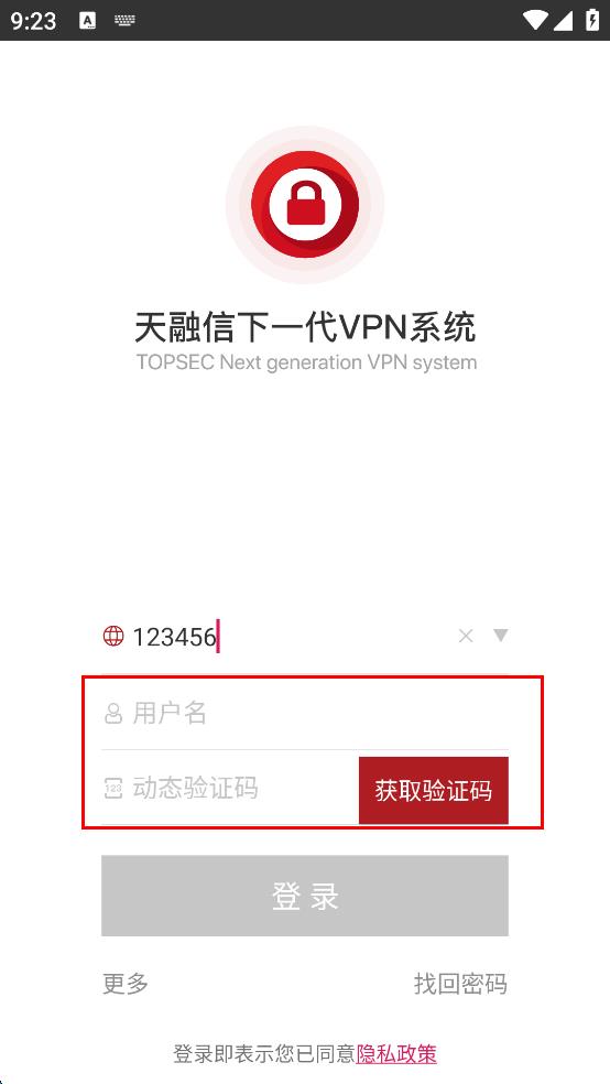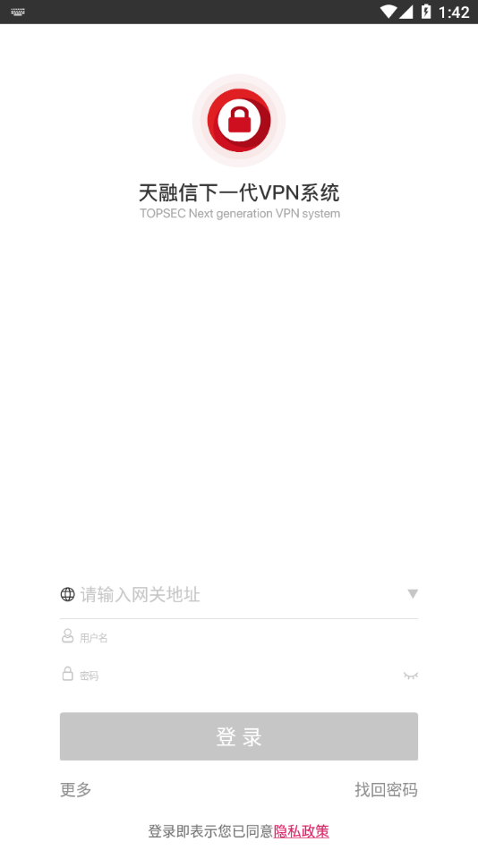 1、进入天融信下一代VPN系统,查看隐私政策概要,了解信息收集、权限授权、信息保护等相关内容后,点击同意。