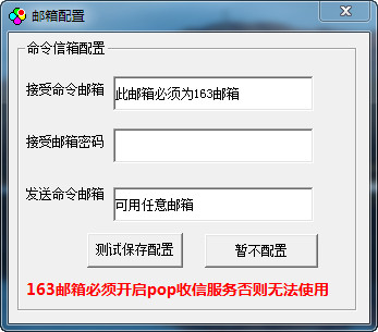 5、进入到配置界面依次填入接受命令的邮箱帐号,密码和发送命令的邮箱帐号。