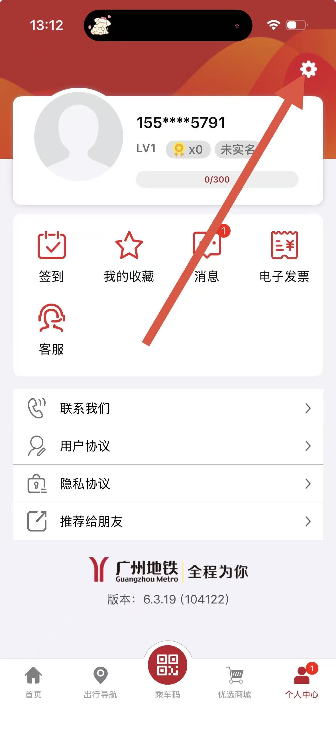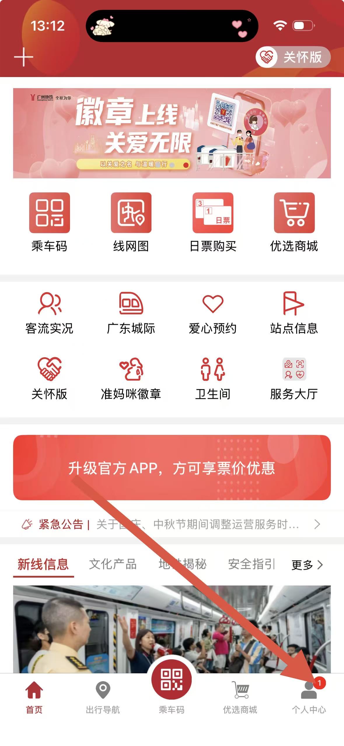 1、打开广州地铁APP,在首页点击右下角个人中心选项,进入个人中心界面。