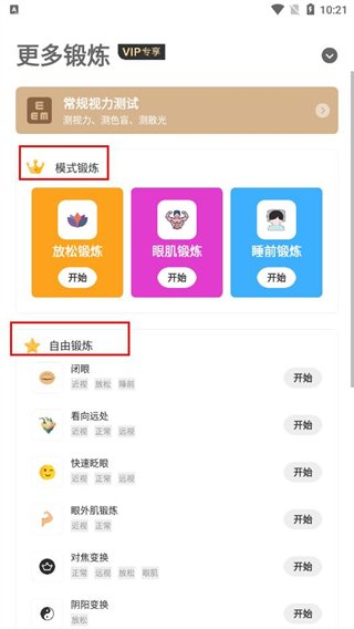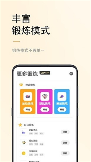 2、提供模式锻炼和自由锻炼等多种锻炼方式。模式锻炼包含放松锻炼、眼肌锻炼、睡前锻炼等;自由锻炼则有闭眼、看向远处等多种锻炼项目。