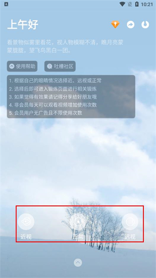 1、打开小视力APP,在首页用户可根据自身眼睛情况,选择近视、正常或远视选项,选定后即可进入相应的锻炼页面,进行针对性的视力训练。
