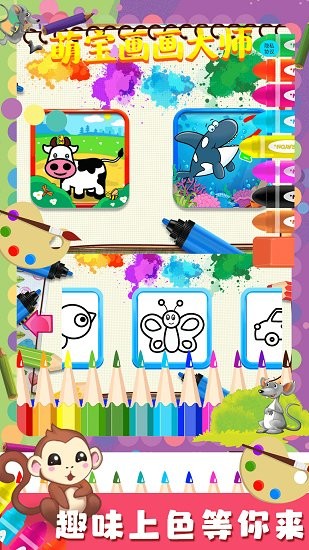 萌宝画画大师是一款能够为孩子进行绘画启蒙的软件,在平台里面有多种绘画工具,能够满足孩子对于画画的渴望,app里面有各种线稿已经准备好了,孩子们要做的是给它们上各种颜色哦,还是蛮好玩的,有兴趣的话欢迎来下载!