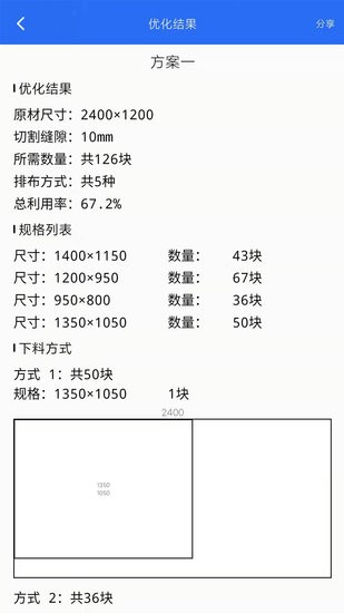板材切割套裁优化功能,可根据设定的原板尺寸、切割料缝宽度,需要切割成的目标数据,得出相对最优的切割方案,并出具切割示意图,用以指导原板切割,减少浪费。