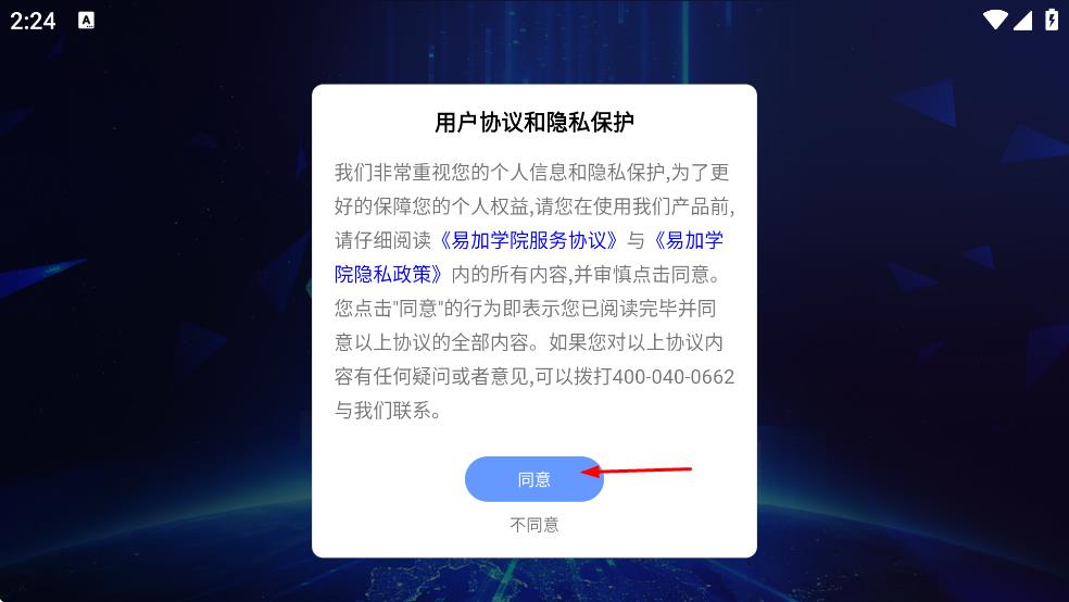 1、打开易加学院,进入用户协议和隐私保护界面,界面说明重视个人信息保护,需阅读易加学院服务协议与易加学院隐私政策,点击“同意”按钮。