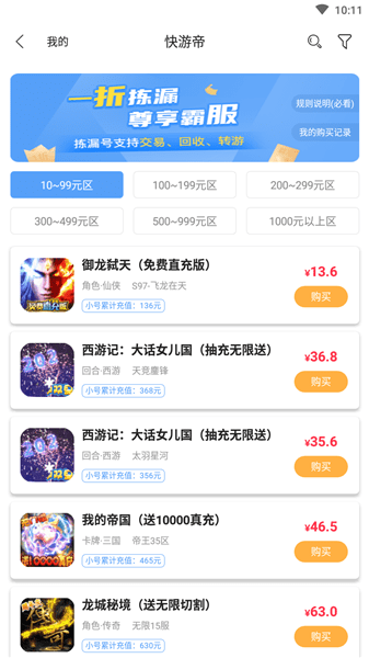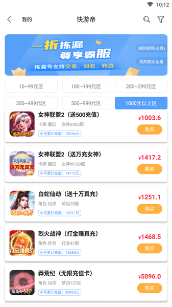 快游帝app收录了各种热门游戏,实时更新游戏资源,进行了详细的分类,玩家可以享受全新福利,提供线上账号交易服务,可以购买到各种稀有账号,支持多种游戏交易,可以查看详细账户资料。