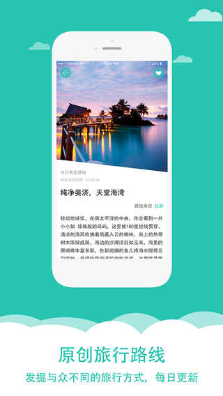 最美路线ios手机版app是一个专为旅游爱好者精心打造的旅游攻略软件。用户可以在线阅读相关旅游资讯,及时掌握旅游动态。这里拥有多种创新的旅游路线方案,你可以选择感兴趣的旅游城市,来一场疯狂的旅行!最美路线每天只推荐一条旅游路线,好机会不容错过哦!