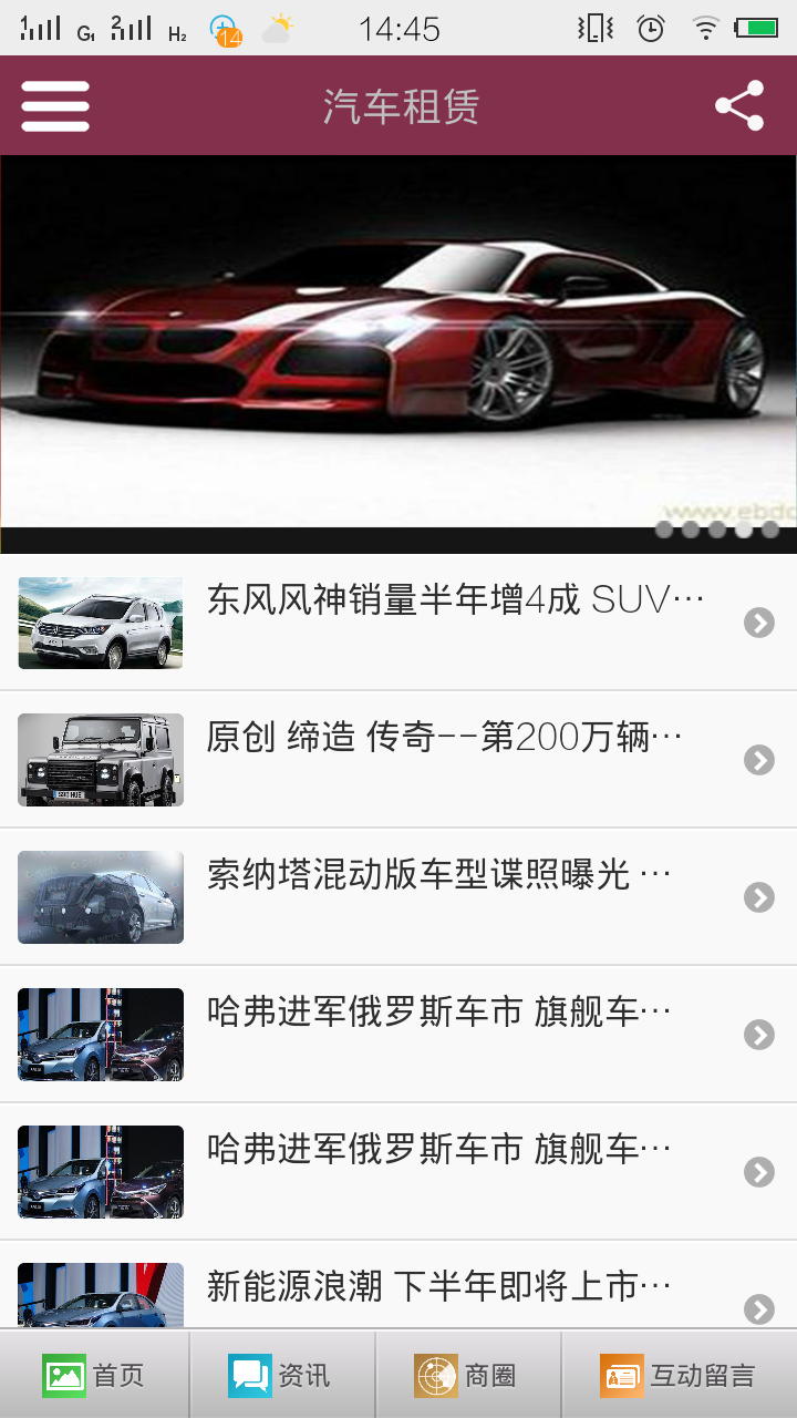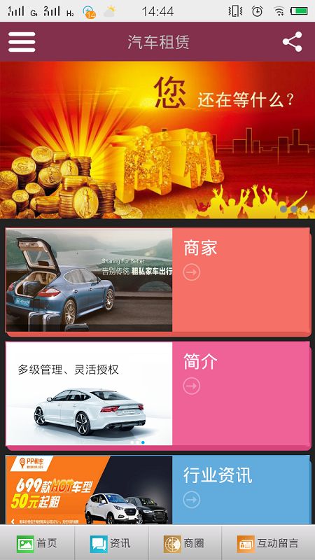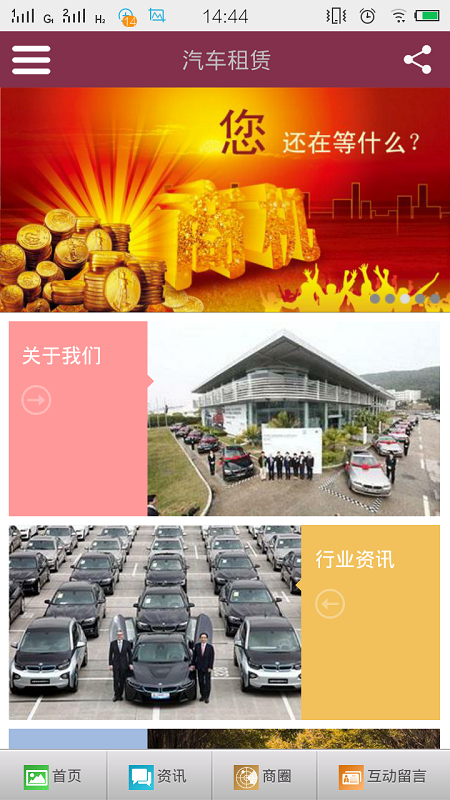 汽车租赁,是一款集汽车资讯和汽车租赁服务为一体的手机应用。这里汇聚了全国各地汽车行业最新资讯,汇齐优质租车公司商家提供在线查询、预约租车服务,诚邀全国各地商家加盟本站,为广大消费者提供专业一体化汽车租赁移动服务,让广大消费者随地随时咨询租车。