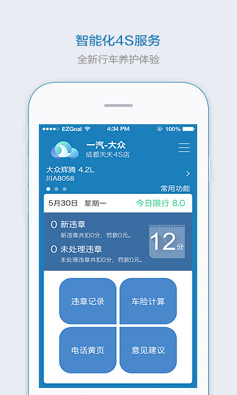 翼畅行作为中国最智能的智慧4S服务平台,有违章查询、车险计算、预约维保、快速救援、事故快处、故障求助、4S客服沟通等多项服务,只为给车主带来最便捷的行车养护服务。