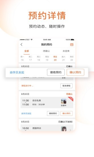 我的预约:支持用户选择查看全部的预约情况,可以自主选择取消课程等;