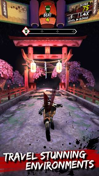 《幽灵忍者》讲述的一个行动神速的忍者复仇的故事,游戏玩法和《神庙逃亡》类似,左右上下划动控制忍者移动、跳跃等动作,而当敌人迎面杀来时,控制忍者跳跃或下滑即可攻击敌人,而且游戏时,视角还会突然变化,敌人会从身后杀来,或用暗器偷袭,非常考验玩家的反应。