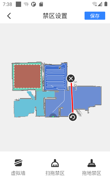 禁区设置:使用手机APP可设置清扫禁区/拖地禁区/虚拟墙,设置完成后,扫地机器人在清扫和扫拖时将不会进入禁区及虚拟墙隔离区域,设置的拖地禁区仅在安装拖布支架后进入扫拖模式生效。