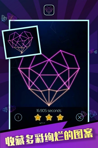 2、将天空中的每个繁星全部呈现在收集屏幕上,不停地连线、旋转,超级有趣。