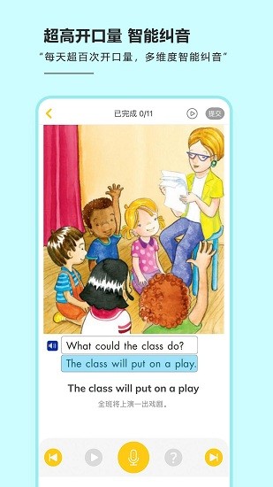 2.智能纠音:逐字逐句进行发音和语速两个维度的打分纠正,让孩子的英语学习有实时的反馈