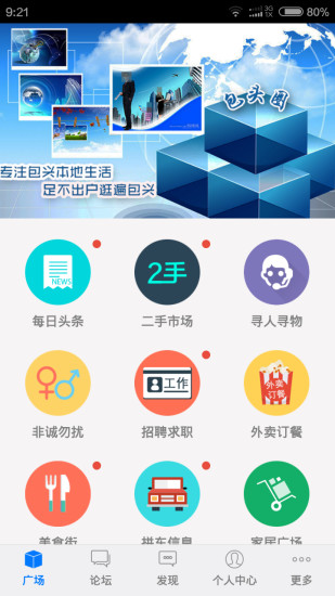 2.包括每日头条、二手市场、寻人寻物、非诚勿扰、招聘求职、外卖订餐等版块。