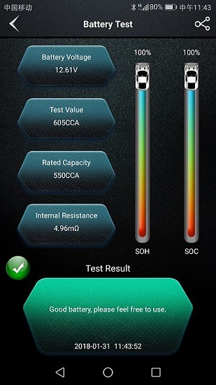 采用目前世界上最先进的电导测试技术,可以通过手机方便、快速、准确的测量汽车起动电池的实际冷起动电流能力CCA,电池本身的健康程度,快速检测汽车起动系统和充电系统的常见故障,以及实时监测电池电压对汽车电池健康状况进行预警,有利于汽车维护保养避免汽车电池和电路出现故障。