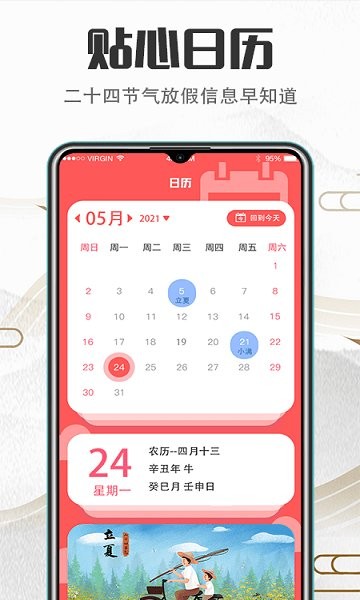 二十四节气、星期数、节假日情况一目了然,还能深入了解二十四节气的由来、习俗及各个节气的养生小妙招,助你更好的生活。