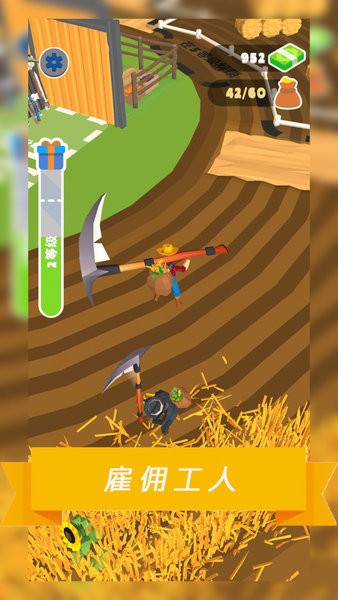 1、卡通画风,立体画面,雇佣工人收割农作物。