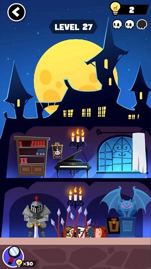 1.游戏中每个场景都有数个骷髅头可以收集,玩家可以通过点击互动来收集这一些收集物品来增加自己获得的分数;