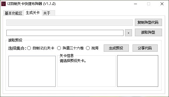 将当前游戏中的阵列生成代码并自动复制到剪贴板,单击[复制阵型代码]即可。同时,您也可以复制别人的代码,在游戏中快速生成。[选择预设]中提供了一些经典的游戏阵型,可供快速生成。