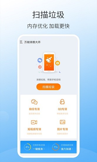 手机万能清理大师是一款免费清理垃圾,一键加速的专业清理类应用,一键清理加速,一键瘦身并带有安全监测功能。超强清理手机垃圾,清除缓存应用内容,实现手机运营加速度的目标。快速释放手机内存,实现手机运行畅快。深度清理微信垃圾,实现聊天无障碍。强效清理视频垃圾,刷视频更流畅。
